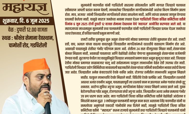 मागील तीन वर्षांपासून गडचिरोली जिल्ह्यात रानटी हत्तींचा धुमाकूळ सुरू आहे. यामुळे शेतकऱ्यांचे मोठ्या प्रमाणावर नुकसान होत आहे. रानटी हत्ती, वाघ, अस्वल यांचा मानवी वस्तीत वावर वाढल्याने नागरिकांमध्ये दहशतीचे वातावरण आहे. अवकाळी पावसामुळे शेतीचे अतोनात नुकसान झाले आहेत. शेतीला २४ तास वीजपुरवठा मिळत नाही. अद्याप शेतकऱ्यांना बोनस मिळालेला नाही. जिल्ह्यात असे अनेक प्रश्न प्रलंबित असताना पालकमंत्री तथा मुख्यमंत्री देवेंद्र फडणवीस यांनी याकडे विशेष लक्ष देणे गरजेचे आहे. मात्र, त्यांना जिल्ह्यासाठी वेळ नाही. त्यामुळे प्रशासनावर कुणाचाही वचक राहिलेला नाही. वारंवार आंदोलन, मागण्या करूनही सर्वसामान्यांचे प्रश्न जैसे थे असल्याने काँग्रेसकडून ६ जून रोजी शहरातील सेमाना देवस्थानात महायज्ञाचे आयोजन करण्यात आले आहे. या माध्यमातून पालकमंत्री फडणवीस यांनी लवकरात लवकर जिल्ह्यात येऊन मागण्यांची दखल घ्यावी, अशी गळ आम्ही घालणार असल्याचे काँग्रेसचे जिल्हाध्यक्ष महेंद्र बामनवाडे यांनी पत्रकाच्या माध्यमातून कळवले आहे. दरम्यान, समाज माध्यमावर काँग्रेसच्या या आगळ्यावेगळ्या आंदोलनाची जोरदार चर्चा आहे.