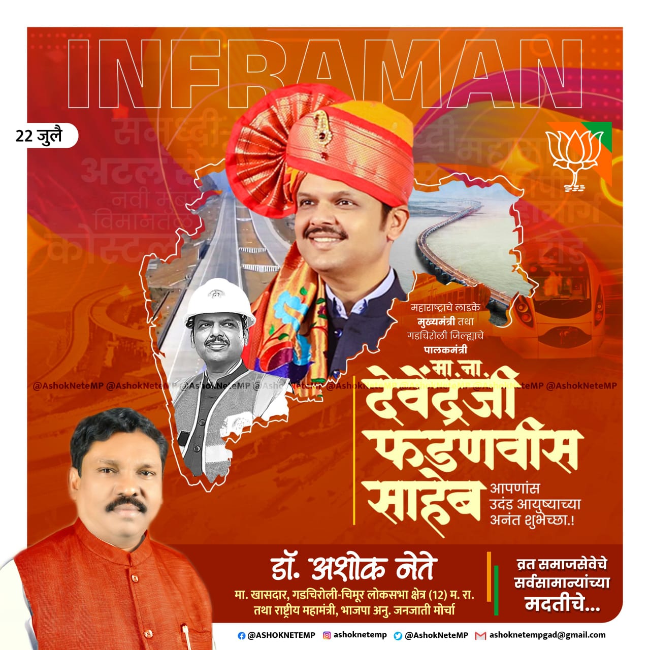 एव्हीबी न्यूज गडचिरोली :- मुख्यमंत्री देवेंद्र फडणविस यांचा वाढदिवस २२ जुलै २०२५ (मंगळवार) सेवाभाव दिन म्हणून साजरा होणार या औचित्याने माजी खासदार तथा भाजपा अनुसूचित जनजाती मोर्चाचे राष्ट्रीय महामंत्री डॉ. अशोकजी नेते यांच्या वतीने गडचिरोली येथे सेवाभावी कार्यक्रमाचे आयोजन करण्यात आले आहे.