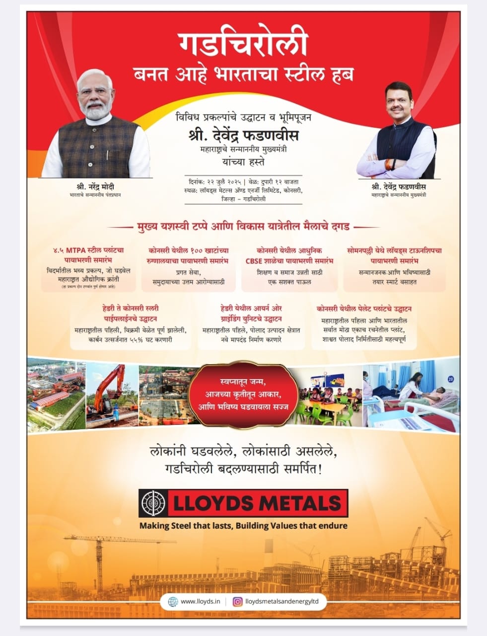 मुख्यमंत्री फडणवीस गडचिरोली जिल्ह्यातील हेडरी येथे ५ दशलक्ष टन प्रतिवर्ष (एमटीपीए) लोहखनिज ग्राइंडिंग प्लांटचा पहिला टप्पा, हेडरी-कोनसरी १० एमटीपीए क्षमतेची स्लरी पाइपलाइन आणि कोनसरी येथे ४ एमटीपीए क्षमतेच्या पॅलेट प्रकल्पाचे उद्घाटन करतील. याशिवाय मंगळवारी दुपारी १२ वाजता होणाऱ्या या कार्यक्रमात ते ४.५ एमटीपीए क्षमतेच्या भव्य एकात्मिक पोलाद प्रकल्पाचे, १००-खाटांच्या रुग्णालयाचे, सीबीएसई पद्धतीच्या शाळेचे भूमिपूजन करतील. सोमनपल्ली येथील एलएमईएलच्या कर्मचारी वसाहतीचेसुद्धा ते भूमिपूजन करतील. गडचिरोली जिल्ह्याचे सहपालकमंत्री अॅड. आशीष जयस्वाल; आमदार धर्मरावबाबा आत्राम; आमदार डाॅ. मिलिंद नरोटे, एलएमईएलचे व्यवस्थापकीय संचालक बी. प्रभाकरन, गडचिरोली परिक्षेत्राचे उपमहानिरीक्षक अंकित गोयल; जिल्हाधिकारी अविश्यंत पंडा, माजी खासदार अशोक नेते, माजी आमदार डॉ. देवराव होळी, कोनसरीचे सरपंच श्रीकांत पावडे; पद्मश्री तुलसी मुंडा आणि इतर मान्यवर प्रामुख्याने उपस्थित राहतील. गडचिरोलीच्या औद्योगिक विकासात हा एक महत्त्वाचा टप्पा आहे. गेल्या काही वर्षांत, एलएमईएलने सुरजागड लोहखनिज खाणी आणि कोनसरी येथील डीआरआय तथा पेलेट प्रकल्प कार्यान्वयीत केल्यापासून स्थानिकांना मिळणाऱ्या रोजगारात लक्षणीय वाढ झाली आहे. रक्तरंजित हिंसेचा मार्ग सोडून शरणागती पत्करलेल्या माओवाद्यांनाही कंपनीने उद्योग-केंद्रित कौशल्यांचे प्रशिक्षण दिले आहे. त्यांना समाजाच्या मुख्य प्रवाहात आणण्याच्या प्रक्रियेला मदत करण्यासाठी त्यांना नोकऱ्यांमध्ये सामावून घेतले आहे. शिवाय या औद्योगिक क्रांतीने गडचिरोलीच्या विकासाला अभूतपूर्व चालना दिली आहे. श्री. बी. प्रभाकरन यांच्या मते, २२ जुलै २०२५ हा दिवस गडचिरोली तसेच महाराष्ट्राच्या इतिहासात सुवर्णाक्षरांनी नोंदवला जाणार आहे. गडचिरोली जिल्ह्यातील कोनसरी येथे विदर्भाच्या भव्य एकात्मिक पोलाद प्रकल्पाची पायाभरणी झाल्यामुळे गडचिरोलीला देशाचे स्टील हब बनवण्याचे ऐतिहासिक स्वप्न साकार करण्याच्या दिशेने एक पाऊल टाकले जात आहे. १४० वर्षांहून अधिक वर्षांपूर्वी गडचिरोली हे भारतीय स्टील उद्योगाचे जन्मस्थान होऊ शकले असते. ती वेळ आज आली आहे. आता खऱ्या अर्थाने गडचिरोलीच्या उदयाची वेळ आली आहे. लॉयड्स मेटल्स अँड एनर्जी लिमिटेडला येथील औद्योगिक क्रांतीचा ध्वजवाहक असल्याचा अभिमान आहे. सुरजागड येथील लोहखनिज खाणींचे यशस्वी हरित संचालन, कोनसरी येथील डीआरआय आणि पेलेट प्रकल्प कार्यान्वित झाल्यानंतर, आता एकात्मिक पोलाद प्रकल्पाच्या रूपात एक मोठी झेप घेतली जात आहे. गडचिरोलीला महाराष्ट्रतील पहिला जिल्हा बनवण्यास मदत केल्याबद्दल आम्