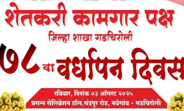 AVB NEWS गडचिरोली : राज्यातील कष्टकरी, कामगार, शेतकरी, शेतमजूर बहुजन श्रमिकांच्या हक्क – अधिकारासाठी लढणाऱ्या शेतकरी कामगार पक्षाच्या ७८ व्या स्थापना दिनानिमित्त रविवार दिनांक ३ ऑगस्ट रोजी गडचिरोली तालुक्यातील मौजा – नवेगाव येथील प्रसन्न सेलिब्रेशन येथे दुपारी १२ वाजता भव्य मेळाव्याचे आयोजन करण्यात आले आहे.