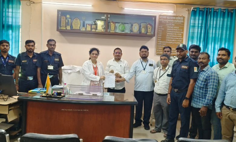 निवेदन देतांना सुरक्षा रक्षक विकास काबेवार निखिल लाडे सचिन बानबले लीलाधर हेटकर रामदास मेश्राम अमोल कंकलवार गणेश मॅकलवारमंगेश ठाकरे नितेश गोवर्धन अश्विन रोहनकर उत्तम आरेकर बळीराम गोरडवार चंद्रशेखर रोहनकर सपना गोवर्धन केतन सहारे प्रतिमा कोहपरे लहू काबेवार भीमराव कराडे