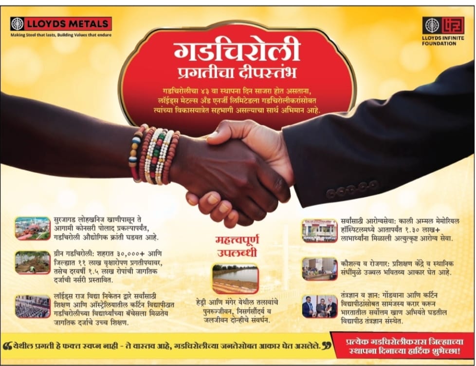 Home/जिल्हा/समस्त गडचिरोली जिल्हावासीयांना जिल्हा वर्धापन दिनाच्या शुभेच्छा शुभेच्छूक ;- लॉयडस् मेटल्स एनर्जी लि. जिल्हा समस्त गडचिरोली जिल्हावासीयांना जिल्हा वर्धापन दिनाच्या शुभेच्छा शुभेच्छूक ;- लॉयडस् मेटल्स एनर्जी लि. AVB NEWSAugust 26, 2025 SHARE AVB NEWSAugust 26, 2025 Share Facebook Twitter WhatsApp Telegram Print